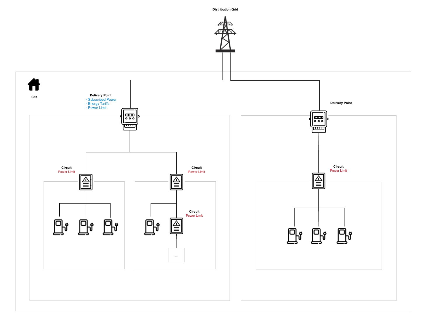 Dreev needs to know the topology of the site's electrical network to take into account power constraints. Some circuits are constrained to a maximum power lower than the sum of the maximum power of all the Charging Stations on that circuit. In this context, Dreev must sometimes anticipate the charging of vehicles in order to respect the constraints of the electrical installation and the drivers mobility needs.